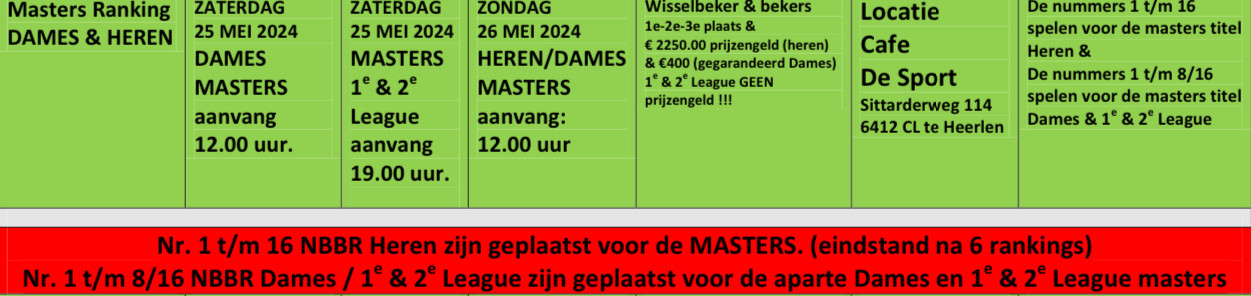 Komend weekend staan de Masters op het programma en wel zaterdag 25 mei aanvang 12.00 uur de Dames Masters, hier zijn de wedstrijden;