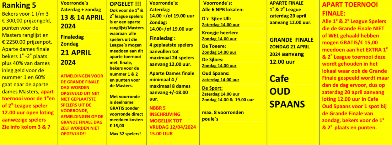 Het aparte 1e & 2e League toernooi is dan op zaterdag 20 april aanvang 12.00 uur in café Oud Spaans te Geleen dit is ook op zondag 21 april de locatie voor de Grand Finale (12.00 uur) en de aparte Dames finale.