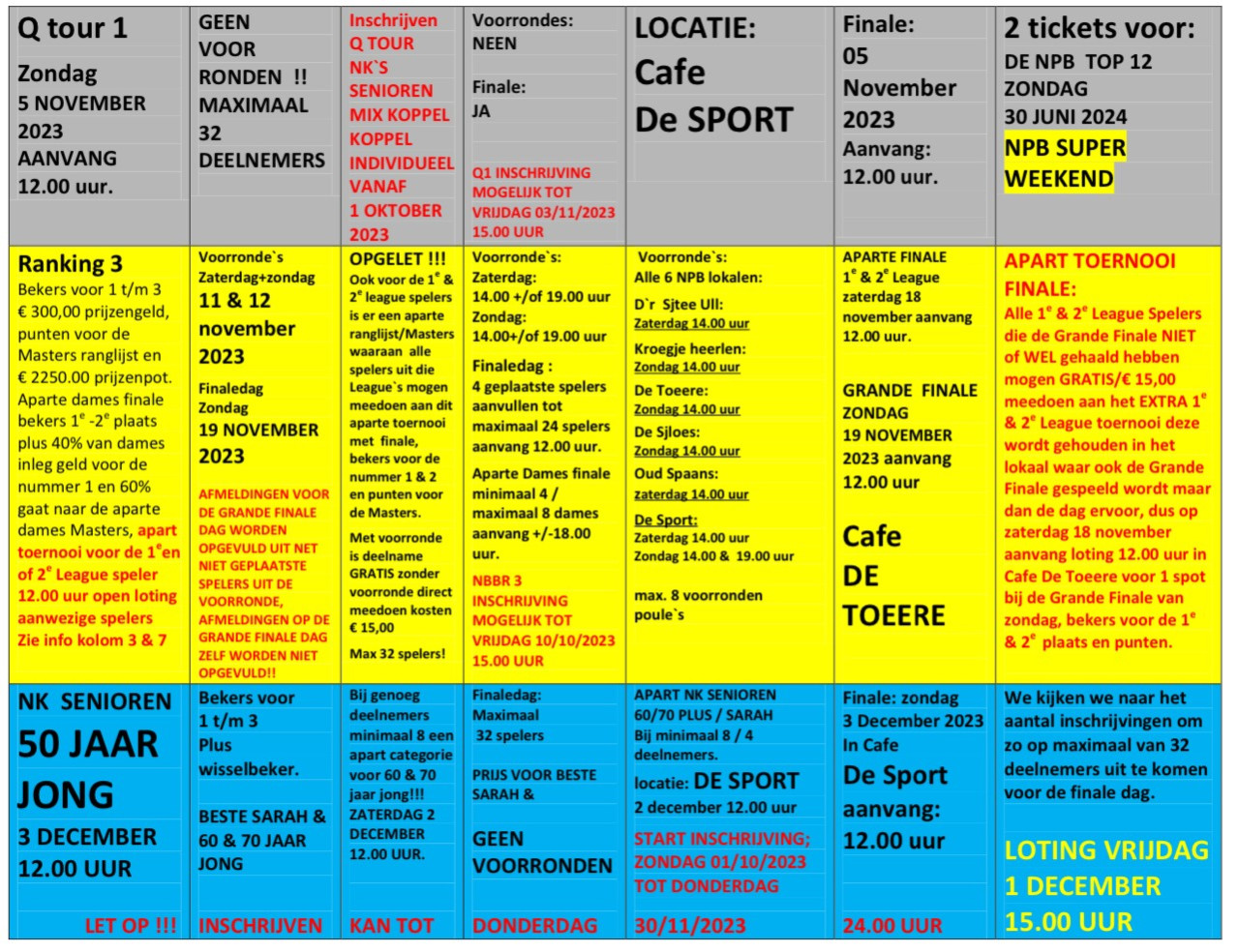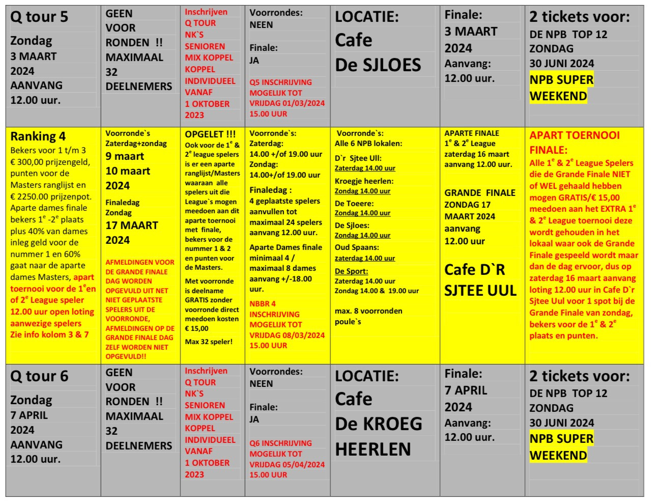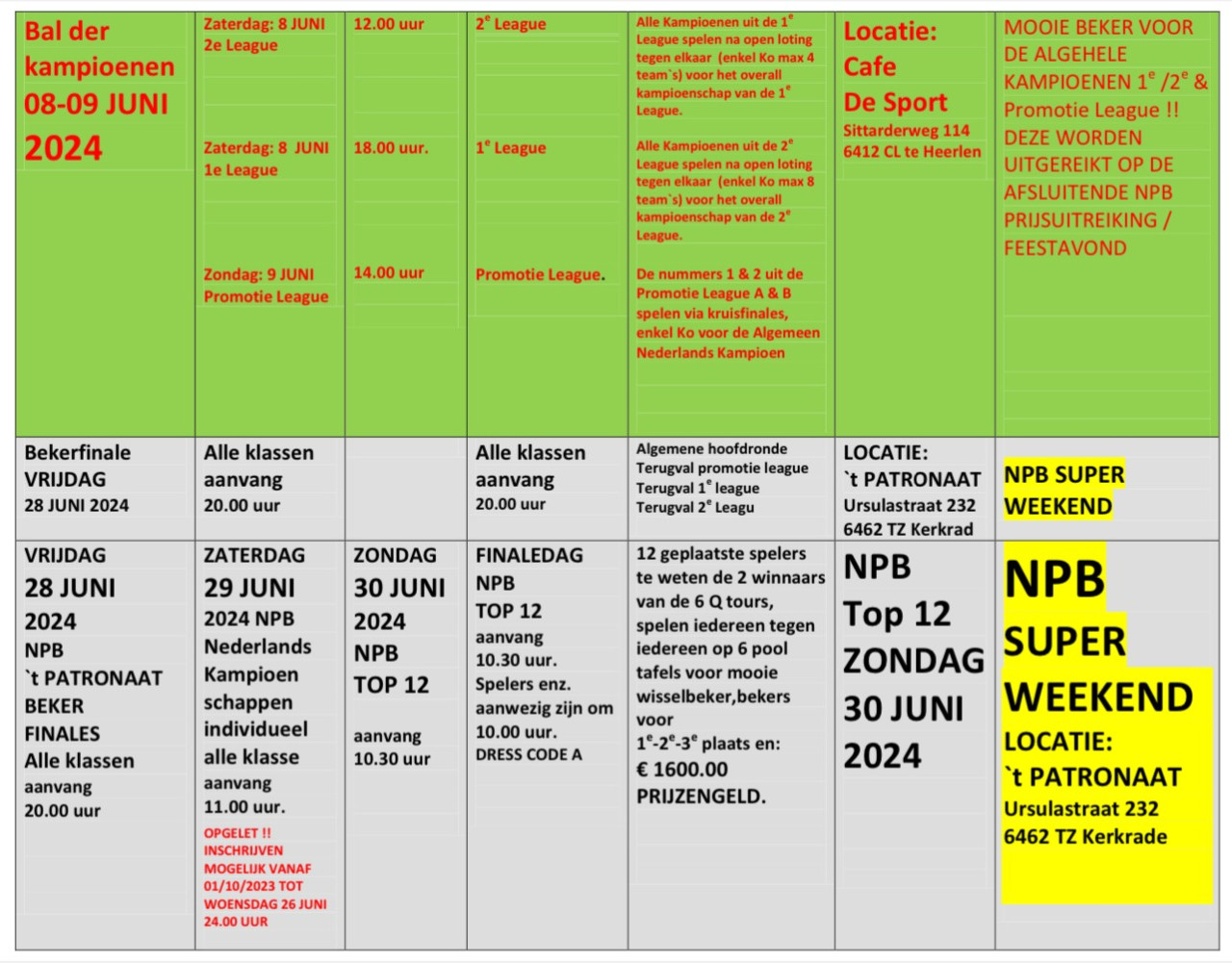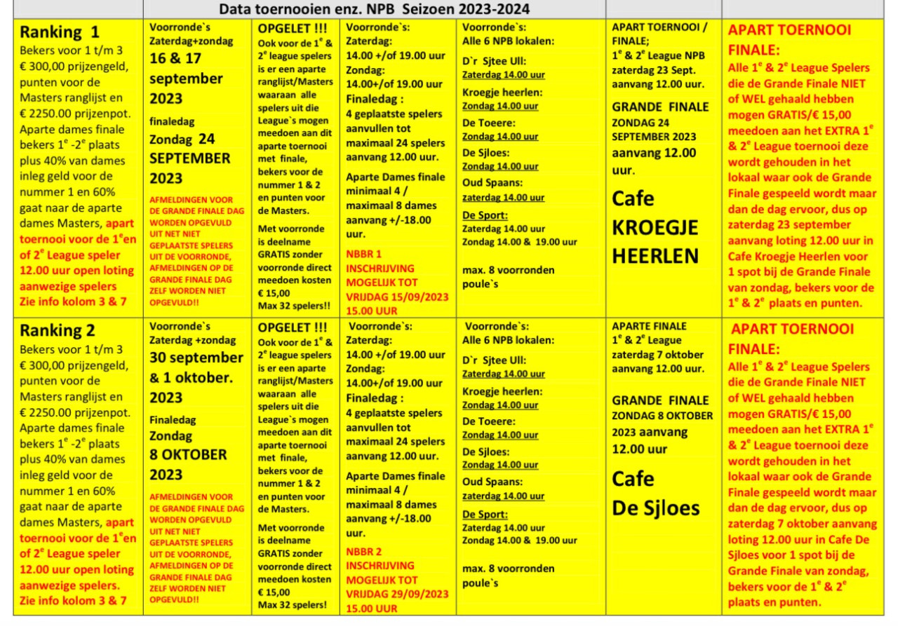 Komend weekend 16 & 17 september starten we weer met de toernooien en afsluitende evenementen van de NPB seizoen 2023-2024 en kunnen zij die dat willen weer meedoen met de 1e NBBR ranking van dit seizoen de Grande Finale is op zondag 24 September in Cafe Kroegje Heerlen aanvang 12.00 uur, waar ook om 18.00 uur de aparte Dames finale wordt gespeelt.