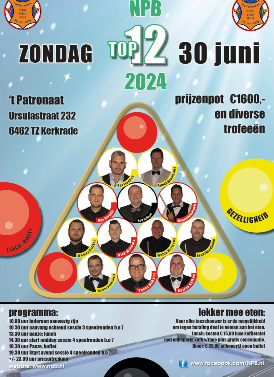 Op zondag 30 juni staat de NPB TOP 12 op het programma waar de 12 geplaatste spelers gaan strijden om de titel, de daarbij behorende trofeeën en prijzengeld.