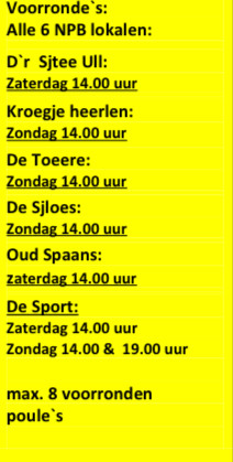 Het aparte 1e & 2e League toernooi is dan op zaterdag 20 april aanvang 12.00 uur in café Oud Spaans te Geleen dit is ook op zondag 21 april de locatie voor de Grand Finale (12.00 uur) en de aparte Dames finale.
