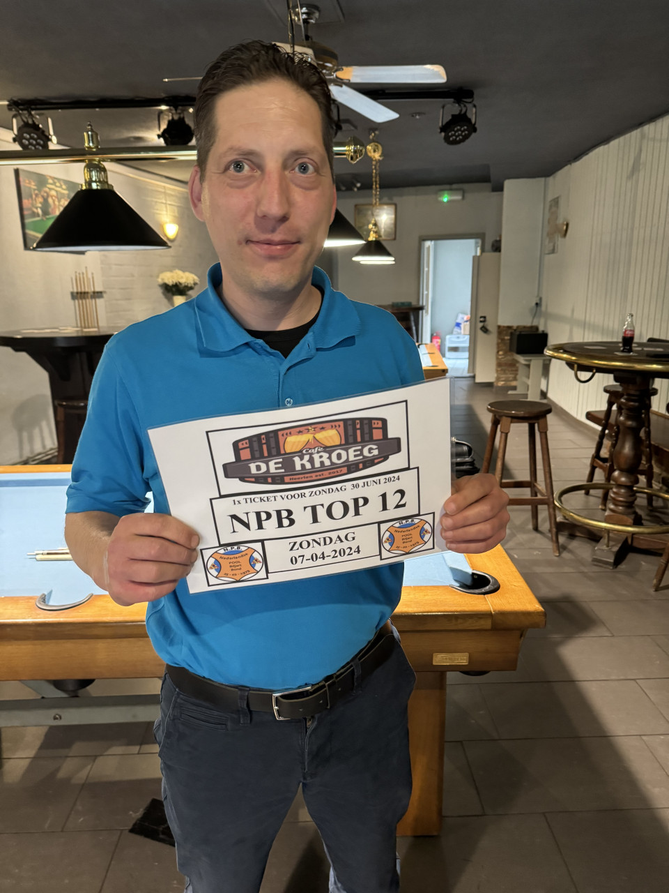 Het eerste ticket ging naar Ron Colson die alle wedstrijden wist te winnen en zo het ticket dan ook dik verdiend had.Het tweede ticket ging naar Michael de Schepper die ondanks de druk die hij zich zelf oplegde toch via de verliezers kant het tweede ticket op eiste en zo zijn de twaalf spelers van de NPB TOP 12 bekend.