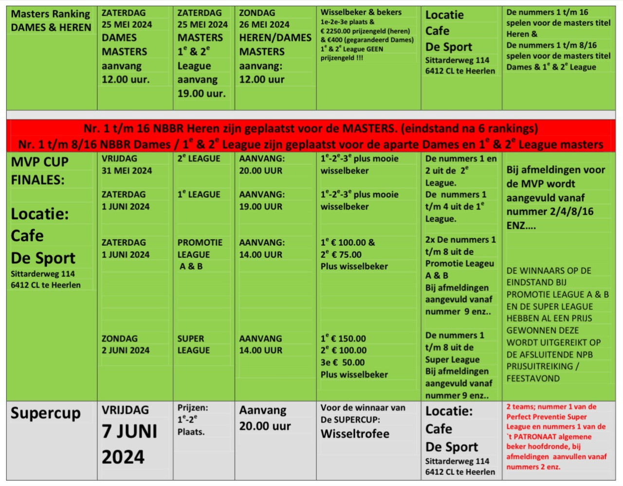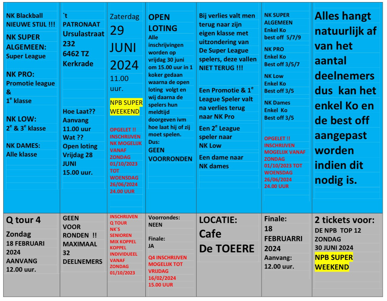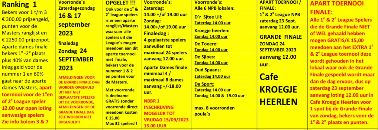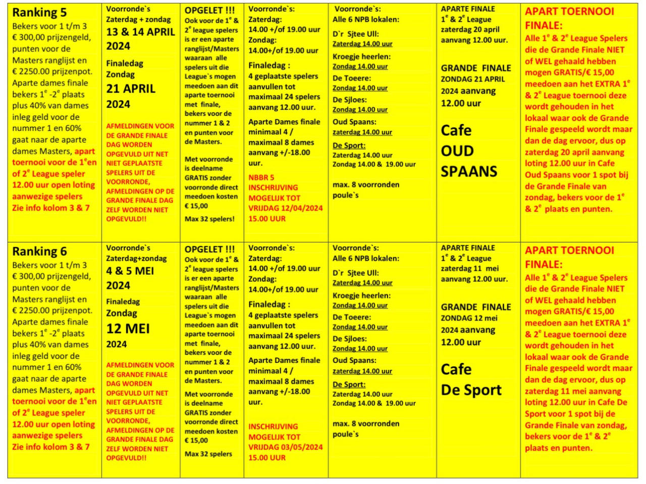 Komend weekend 16 & 17 september starten we weer met de toernooien en afsluitende evenementen van de NPB seizoen 2023-2024 en kunnen zij die dat willen weer meedoen met de 1e NBBR ranking van dit seizoen de Grande Finale is op zondag 24 September in Cafe Kroegje Heerlen aanvang 12.00 uur, waar ook om 18.00 uur de aparte Dames finale wordt gespeelt.
