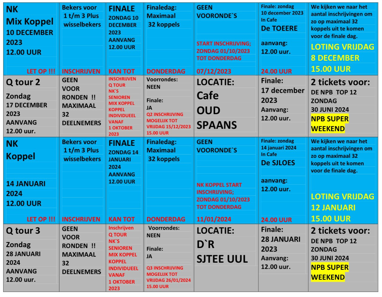 Dan nu het komende weekend de voorronden wederom in de zelfde lokalen/tijden als afgelopen seizoen, je kan je opgeven via de NPB site of via Whats App op 0651106291 tot as vrijdag 15 september 15.00 uur, zodat wij kunnen kijken wie waar speelt en met hoeveel spelers zodat we de spots kunnen verdelen waarna de loting gedaan wordt.
